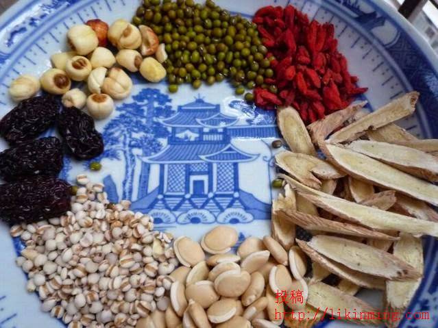 主要成份:绿豆50 克+扁豆50 克+莲子50 克+薏米50 克+大枣30 克+枸杞10 克( 是1个人5 天的用量)