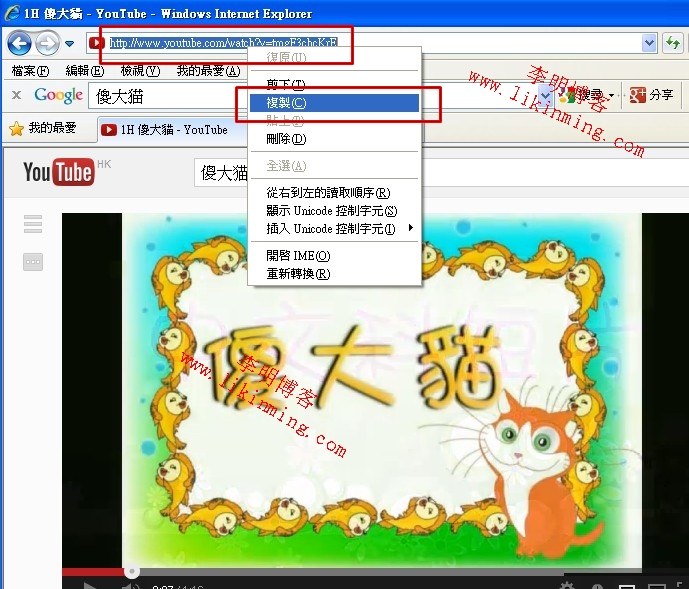 第1步 进入YouTube网站之后,在想下载的影片页面中,把该网址列上的网址复制下来。