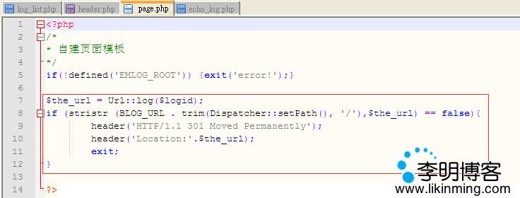 $the_url = Url::log($logid); if (stristr (BLOG_URL . trim(Dispatcher::setPath(), '/'),$the_url) == false){ header('HTTP/1.1 301 Moved Permanently'); header('Location:'.$the_url); exit; }